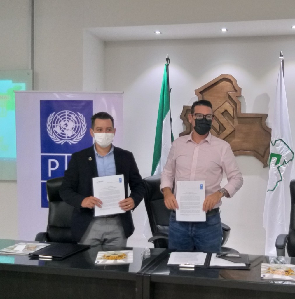 El Oficial a cargo en Bolivia del PNUD, Dennis Funes Escobar, y el presidente del Directorio de CADECOCRUZ, Aldo Sülzer Limpias, sellaron la alianza con la firma presencial de documento.